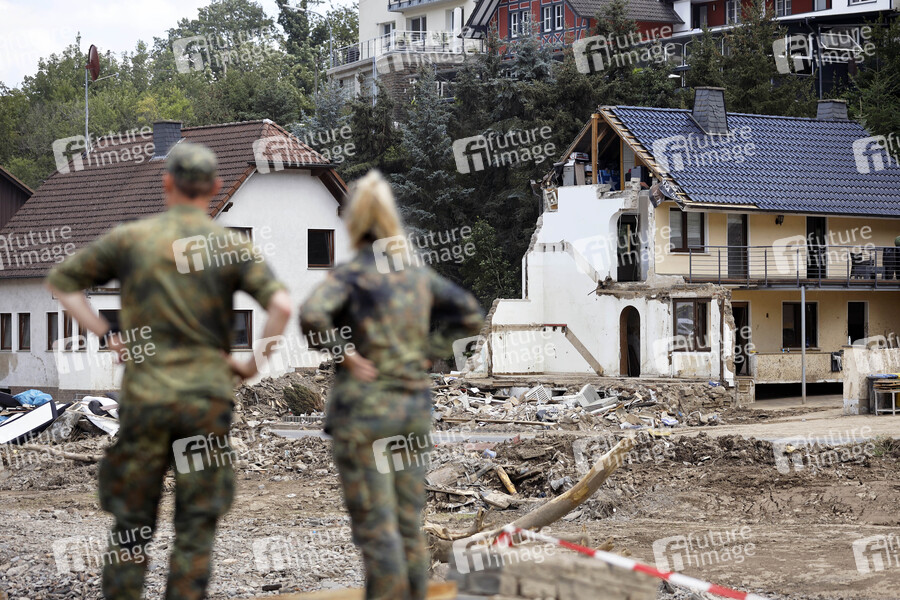 Nach dem Jahrhunderthochwasser in der Eifel durch heftige Regenfälle und Dauerregen mit Überschwemmungen und Überflutungen haben die Aufräumarbeiten im Ahrtal große Fortschritte gemacht. Einheiten von Polizei, THW, Bundeswehr und Feuerwehr mitsamt vielen freiwilligen Helfern haben Straßen geräumt, Schutt und Schlamm entfernt und die Menschen versorgt. Der Wiederaufbau wird trotzdem Jahre dauern. Im Bild Soldaten und Flutschäden in der Ortschaft Dernau, in der die Flut viele Häuser zerstörte, 30.07.2021