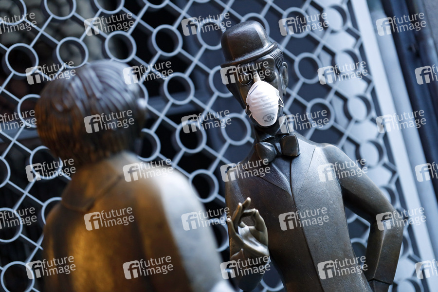 Die Figuren von Tünnes und Schäl in der Altstadt tragen Mundschutz während der Corona-Krise. Köln, 20.03.2020