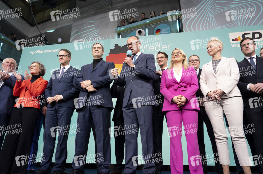 Carsten Linnemann, Markus Söder und Friedrich Merz mit weiteren CDU/CSU Politikern beim Wahlabend der CDU im Konrad-Adenauer-Haus. Berlin, 23.02.2025
