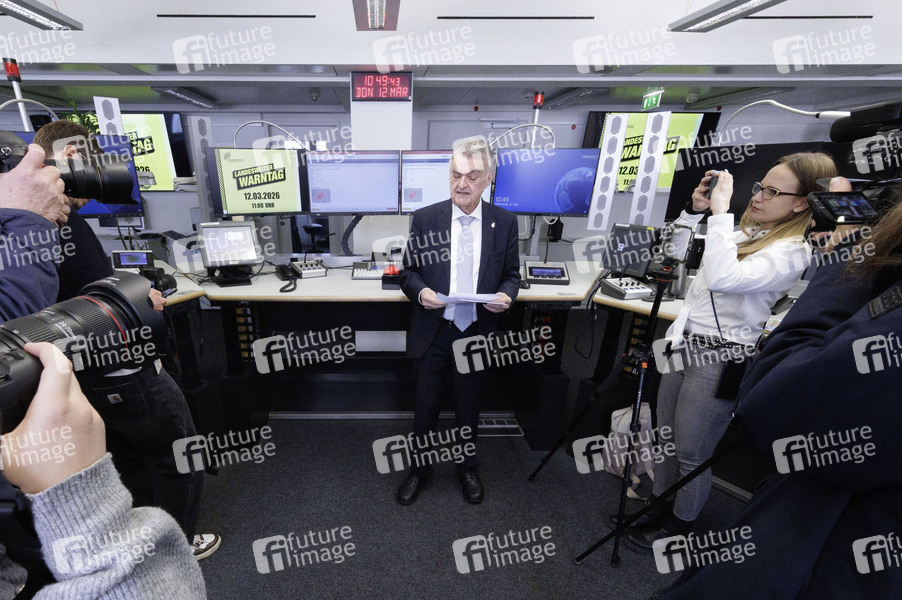 Herbert Reul löst im Rahmen des landesweiten Warntages persönlich den Alarm im Lagezentrum des Innenministeriums aus. Mit dem Betätigen des Alarmknopfes werden die an das Modulare Warnsystem (MoWaS) angebundenen Warnmittel aktiviert und die Warnmeldungen über Cell Broadcast, die Warn-App NINA, digitale Stadtwerbetafeln, Hörfunk und Fernsehen sowie weiteren Medien verbreitet. Düsseldorf, 12.03.2026