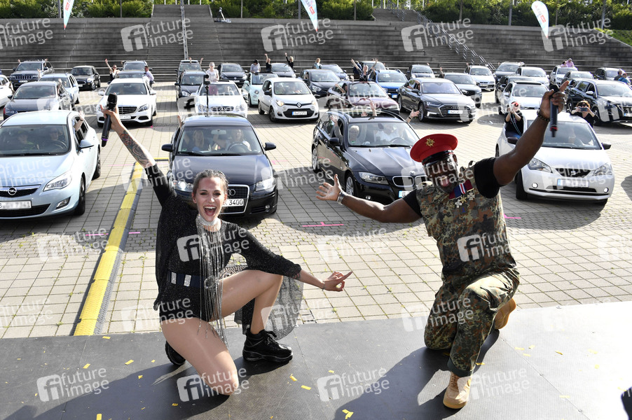 Sängerin, Sänger, Eurodance, Musik, Konzert, Auftritt, Bühne, Stage, live, Unterhaltung, Entertainment, Kultur, Corona, Sars-CoV-2, Covid-19, Coronavirus, Coronakrise, Corona-Krise, Corona-Pandemie, Coronamaßnahmen, Corona-Schutz, Kontaktverbot, Mindestabstand, Social Distancing, Abstand, Abstandhalten, Abstandsregel, Auto, Autokonzertreihe, Autokonzert, Auto-Konzert