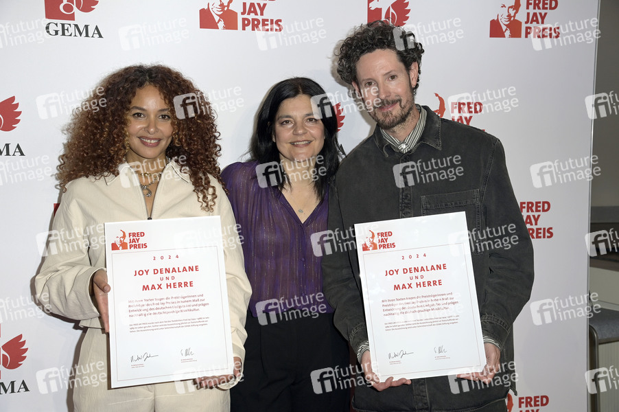 Joy Denalane, Jasmin Tabatabai und Max Herre bei der Verleihung des Fred Jay Preises 2024 im bcc Berlin Congress Center. Berlin, 14.05.2024