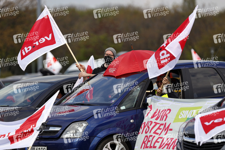 Fahnen von Ver.di bei der Kundgebung des NRW DGB zum Ersten Mai im Autokino an der Merkur Arena. Düsseldorf, 01.05.2021