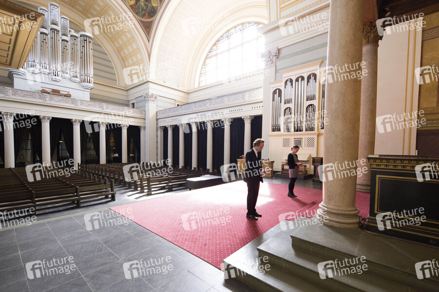 Die Pfarrerin Aline Seel und der Pfarrer Matthias Miele begehen den Karfreitag Gottesdienst in der menschenleeren St. Nikolaikirche. Um 15:00 Uhr ertönten die Glocken der Kirche. Potsdam, 10.04.2020