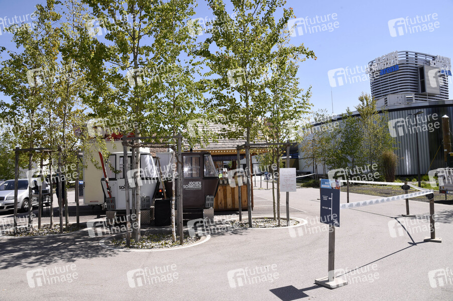 Das Volksfest Taufkirchner Auto Dult auf dem Gelände der Jochen Schweizer Arena ist in Corona-Zeiten an folgende Bedingungen geknüpft: Abholung nur als Drive-In, Bestellung am Auto, Mundschutz tragen und Verzehr nur im Auto oder Zuhause erlaubt. Taufkirchen, 08.05.2020