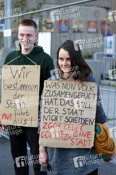 Demonstranten protestieren gegen die geschlossene Grenze zwischen Zgorzelec und Görlitz. Zur Eindämmung des Coronaviruses haben unter anderem Polen und Tschechien Mitte März die Grenzen nach Deutschland geschlossen. Hintergrund des Protestes sind die aktuellen Einschränkungen für Arbeiter, die normalerweise täglich nach Deutschland pendeln, jetzt aber nach Wiedereinreise nach Polen in zweiwöchige Quarantäne müssten. Außerdem sind grenzübergreifende, familiäre Kontakte durch die geschlossenen Grenzen nahezu ausgeschlossen. Görlitz, 24.04.2020