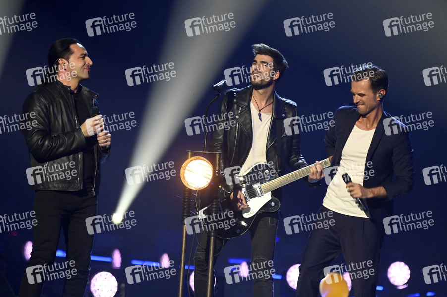 Bülent Ceylan, Martin Goldenbaum (Brenner) und Florian Silbereisen in der TV Show 'Schlagerbooom 2021 - Alles funkelt! Alles glitzert!' in der Dortmunder Westfalenhalle. Dortmund, 23.10.2021