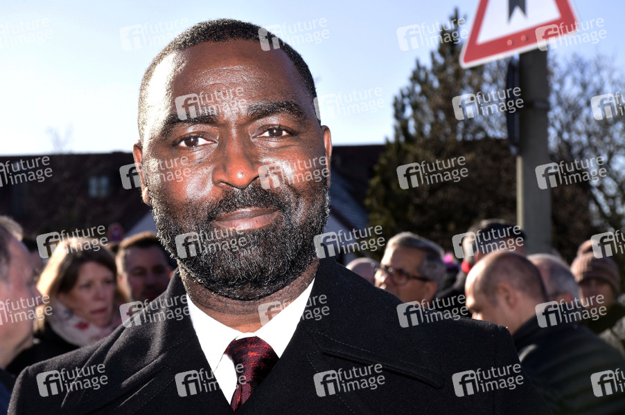 Andy Cole bei der Grundsteinlegung für eine Gedenkvitrine zum 62. Jahrestag des Flugzeugunglücks am damaligen Flughafen München-Riem, bei dem 23 Menschen ums Leben kamen, darunter acht Fußballspieler von Manchester United, am Manchesterplatz. München, 06.02.2020