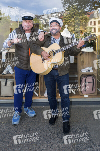 Klaus Baumgart und Claas Vogt von Klaus & Klaus beim Fototermin vor der Textildruckerei EINDRUCK, welche Mund-Nase-Masken mit dem echten Lächeln der Träger herstellt. Hamburg, 06.05.2020