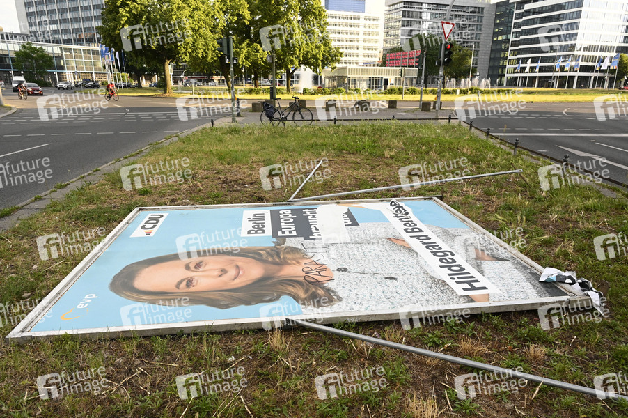 Umgefallenes und beschmiertes Wahlplakat der CDU für die bevorstehenden Wahlen zum Europäischen Parlament am Ernst -Reuter-Platz. Berlin, 01.06.2024