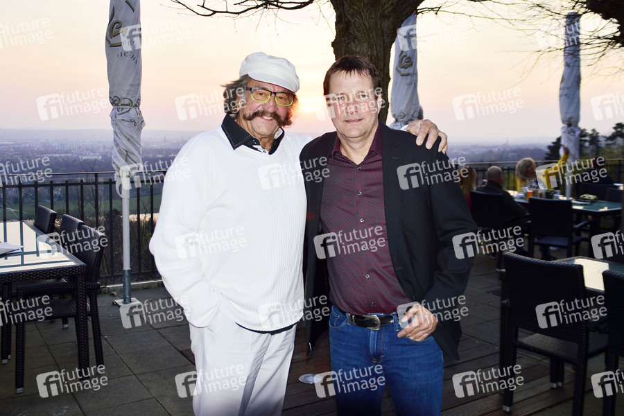 Karl-Heinz Bellmann und Torsten Gütschow bei der Aufzeichnung der MyTVplus Talkshow 'Balkongespräche' im Luisenhof. Dresden, 03.04.2019
