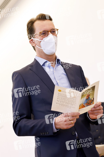 Politiker, NRW-Ministerpräsident, Ministerpräsident des Landes Nordrhein-Westfalen, CDU, Fototermin, Sternsinger, Sternsingen 2022, Kirche, Glaube, Segen, Erzbistum Köln, Dreikönigssingen, Heilige Drei Könige, Caspar, Melchior, Balthasar, CMB, Diözese Aachen, Glaube, römisch-katholische Kirche, Dreikönigstag, Brauch, Brauchtum, Tradition, Carol Singers, Masken, Corona, Maskenpflicht, Schutz, Gesang, Gesangsheft