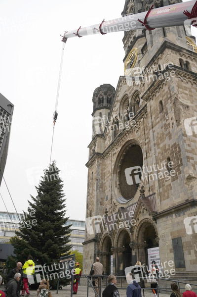 Aufstellung einer 17 Meter hohen Nordmanntanne für den Weihnachtsmarkt auf dem Breitscheidplatz vor der Kaiser-Wilhelm-Gedächtnis-Kirche. Berlin, 02.11.2021