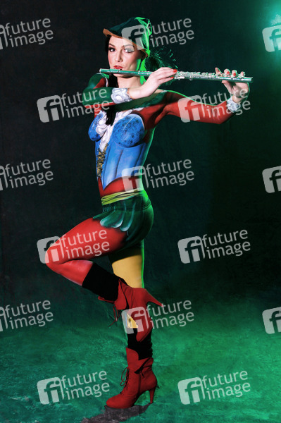 Bodypainting, Erotik, Frau, Mädchen, nackt, drinnen, weiblich, Körperkunst, Kunst, Malerei, Flöte, erotic, woman, girl, nude, indoor, female, body art, body painting, flute