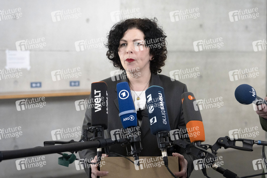 Amira Mohamed Ali übergibt Einspruch vom BSW gegen das amtliche Endergebnis der Bundestagswahl 2025 beim Wahlprüfungsausschuss im Paul-Löbe-Haus. Berlin, 23.04.2025