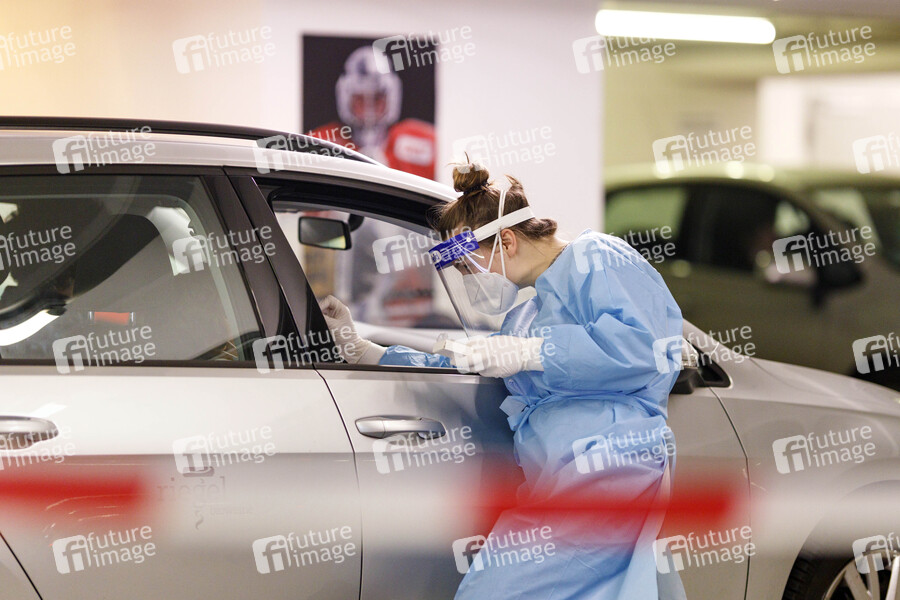 Mit dem 'Bürgertest' haben alle Einwohner Deutschlands die Möglichkeit, sich kostenlos auf eine Infektion mit dem Corona-Virus testen zu lassen. Die Drive-in-Teststation an der Lanxess-Arena bietet diese Möglichkeit jetzt ohne Begrenzung an. (Symbolbild, Themenbild) Köln, 15.04.2021
