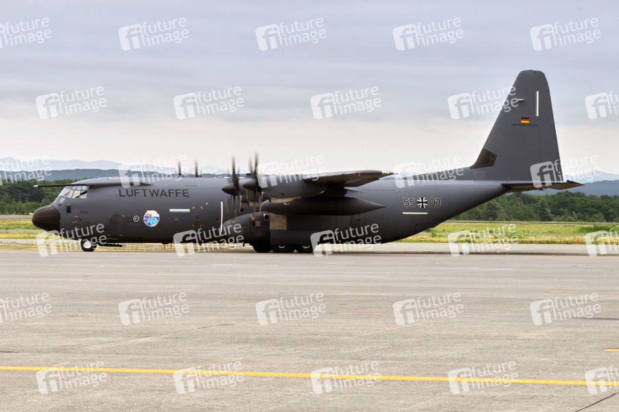 Ein Lockheed C-130 Hercules Transportflugzeug der deutschen Luftwaffe bei der Ankunft auf der JASDF Chitose Air Base zur bisher größten gemeinsamen Luftstreitkraftübung 'Pacific Skies 24'. Der Luftwaffebstützpunkt ist der Hauptstützpunkt der Japan Air Self-Defence Force in Nordjapan und hat die Aufgabe, Japans Seegrenzen zu Russland zu überwachen. Chitose, 19.07.2024