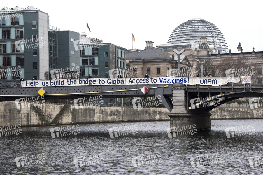 Plakataktion der Universities Allied for Essential Medicines (UAEM) für die gerechtere Verteilung der Impfstoffe weltweit. Die UAEM setzt sich weltweit in 21 Ländern für einen globalen Zugang zu medizinischer Versorgung und einer am sozialen Nutzen orientierten Forschung ein. Berlin, 05.02.2021
