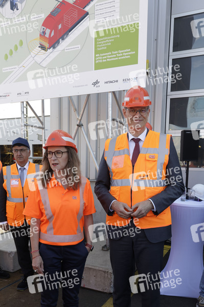 Sigrid Nikutta und Patrick Schnieder bei der Vorstellung der ersten Güterzuglokomotive, die für den automatisierten Streckenbetrieb umgerüstet wurde im DB Cargo-Werk Köln-Gremberg. Köln, 04.07.2025