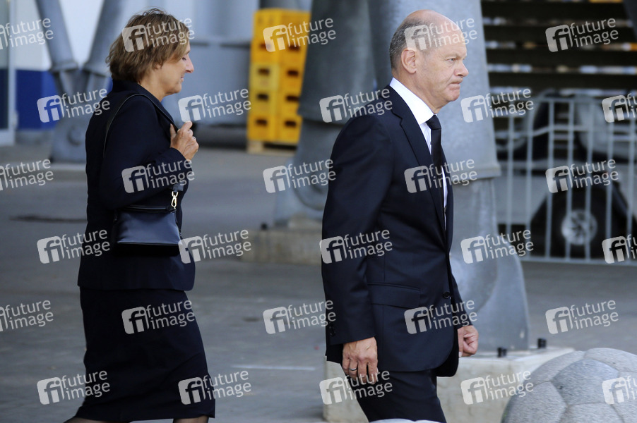 Olaf Scholz mit Ehefrau Britta Ernst bei der Trauerfeier für Uwe Seeler im Volksparkstadion. Hamburg, 10.08.2022