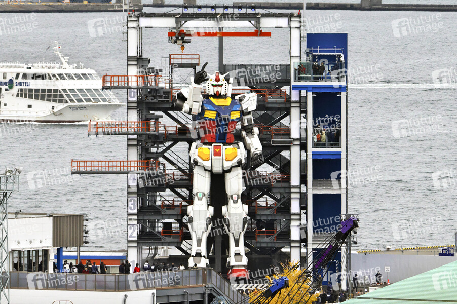 Der 19 Meter großer Modell-Roboter RX-78-2 Gundam aus der Animationsserie 'Kido Senshi Gundam / Mobile Suit Gundam' bei der Eröffnung der Gundam Factory Yokohama am Yamashita Pier. Der Roboter im Originalmaßstab kann insgesamt 24 Gelenke bewegen. Jede halbe Stunde nimmt er eine andere Pose ein und abends wird er beleuchtet. Yokohama, 19.12.2020