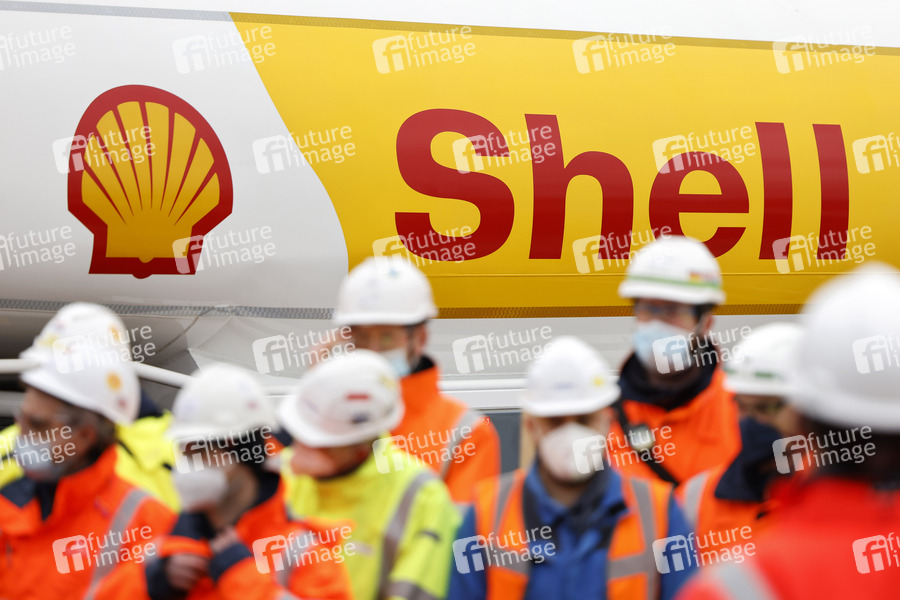 Shell-Logo auf einem Tankwagen bei der Eröffnung der Baustelle für Deutschlands größte Anlage zur Herstellung von Bio-Flüssiggas auf dem Gelände des 'Shell Energy an Chemicals Park Rheinland'. Köln, 09.02.2022