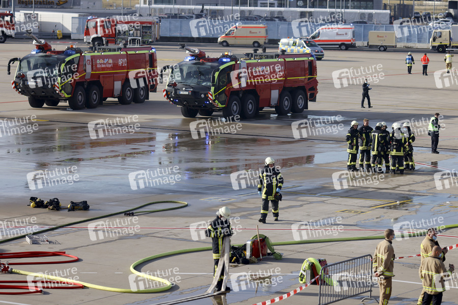 Einsatzkräftei der gemeinsamen ICAO-Notfallübung der Werkfeuerwehr, der Feuerwehr Köln, THW, Landespolizei, Bundespolizei und Bundeswehr am Köln Bonn Airport. Im Rahmen der Übung wird die Kollision eines Flugzeugs mit einem Passagierbus und einer Abfertigungshalle simuliert. Einsatzkräfte retten Verletzte aus dem in Brand geratenen Flugzeug. Köln, 06.11.2021