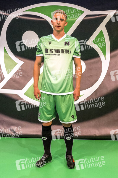 Niklas Tarnat mit grünem Ausweichtrikot bei der Präsentation der Hannover 96-Trikots des neuen Ausrüsters Macron für die Saison 2019/20 in der HDI Arena. Hannover, 16.06.2019