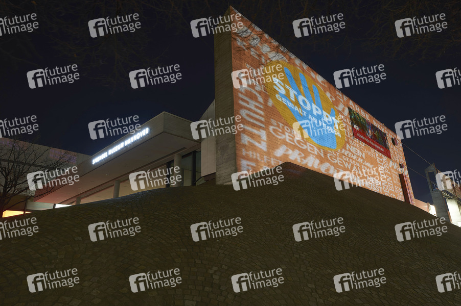 Beleuchtetes Sprengel Museum - Seit 2016 wird am internationalen Aktionstag gegen Gewalt an Frauen und Mädchen auch ein sichtbares Zeichen gesetzt. Gebäude auf der ganzen Welt erstrahlen am 'Orange Day' in orangem Licht. Hannover, 25.11.2020
