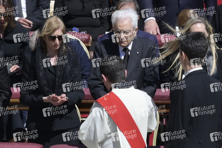Sergio Mattarella mit Tochter Laura Mattarella bei der Trauermesse für den verstorbenen Papst Franziskus auf dem Petersplatz. Vatikanstadt, 26.04.2025