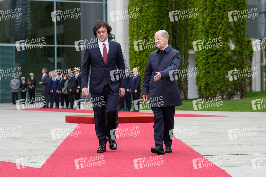 Irakli Kobachidse und Olaf Scholz beim Empfang des Premierministers von Georgien mit militärischen Ehren und zu einem gemeinsamen Gespräch mit dem Bundeskanzler mit anschließendem Pressestatement im Bundeskanzleramt. Berlin, 12.04.2024