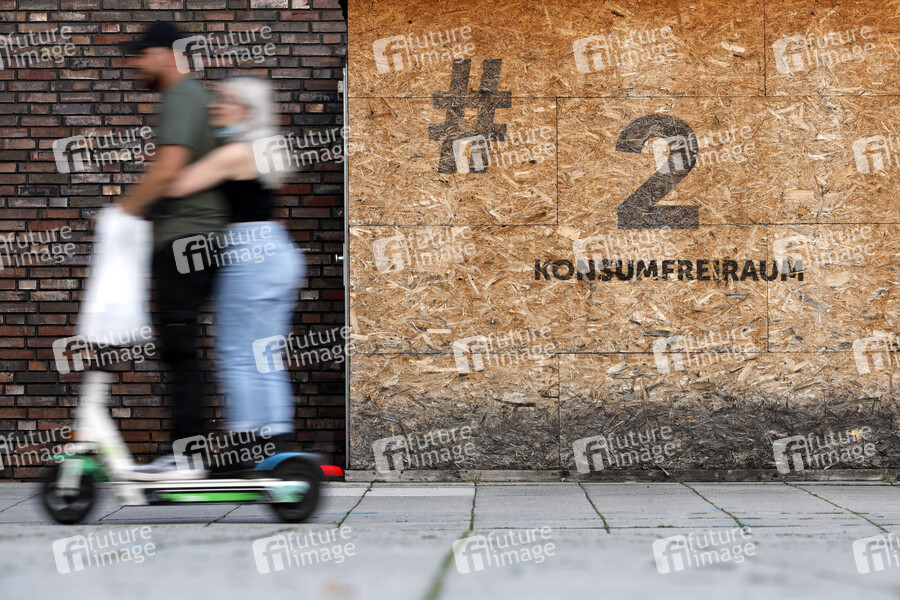 Eine Holzbox mit der Aufschrift 'Konsumfreiraum' am Neumarkt in Köln. Die Holzboxen wurden von der Stadt Köln an einigen Ecken aufgestellt, wo Drogenabhängige vorher versteckt ihre Drogen konsumierten. (Themenbild, Symbolbild) Köln, 18.09.2021