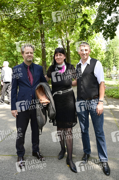 Ulrich Kastner, Heike Müller aka Heike Valentin und Markus Müller bei der Trauerfeier und Urnenbeisetzung für Bernd Müller aka Teufelsgeiger Mister Miller auf dem Friedhof Berlin-Adlershof. Berlin, 23.07.2024