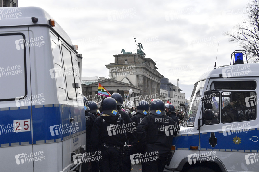 Tausende Demonstranten protestieren am Brandenburger Tor und im Regierungsviertel gegen die Corona-Politik der Regierung. Wegen der massenhaften Verstöße gegen die Hygieneauflagen droht die Polizei mit Auflösung der Versammlung. Das Gelände vor dem Bundestag ist abgesperrt, dort sind Proteste verboten. Berlin, 18.11.2020