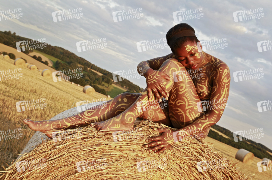 Bodypainting, Erotik, Frau, Mädchen, Afrikanerien, nackt, draußen, weiblich, Körperkunst, Kunst, Ornamente, Malerei, Feld, Acker, Stoppelfeld, Heuballen, Stroh, Landwirtschaft, Ernte, Abendsonne, erotic, African woman, girl, nude, outdoor, female, body art, body painting, ornaments, field, hay, straw, farming, harvest, evening sun