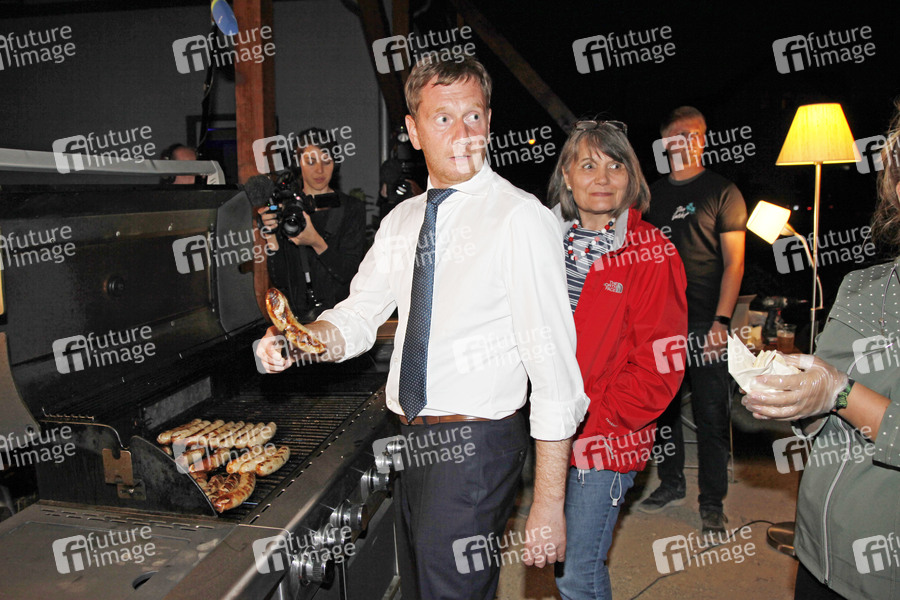 Politiker, CDU, Ministerpräsident von Sachsen, Politik, Wahl, Wahlkampf, Partei, Wahlkampfveranstaltung, Parteienwerbung, Kandidat, Kampagne, Wahlen, Bratwurst grillen