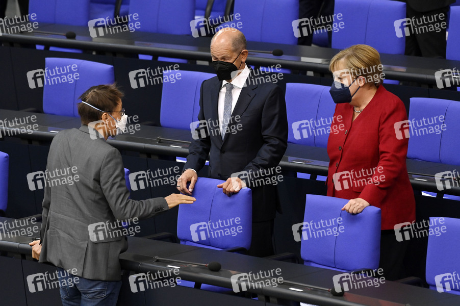 Karl Lauterbach, Olaf Scholz und Angela Merkel in der 238. Sitzung des Deutschen Bundestages im Reichstagsgebäude. Berlin, 25.08.2021