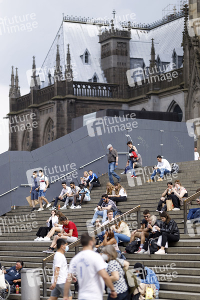Bei fallenden Inzidenzzahlen und steigenden Temperaturen drängen sich viele Menschen in der Kölner Innenstadt auf der Domtreppe. In Nordrhein-Westfalen gelten weitere Öffnungsschritte, sie ergänzen die Lockerungen, die in der Coronaschutzverordnung vom vorgesehen sind. Es gilt ein Stufenplan mit Öffnungsschritten für die Landkreise und kreisfreien Städten ohne Notbremse, also mit einer stabilen Sieben-Tage-Inzidenz von unter 100. (Themenbild, Symbolbild) Köln, 04.06.2021