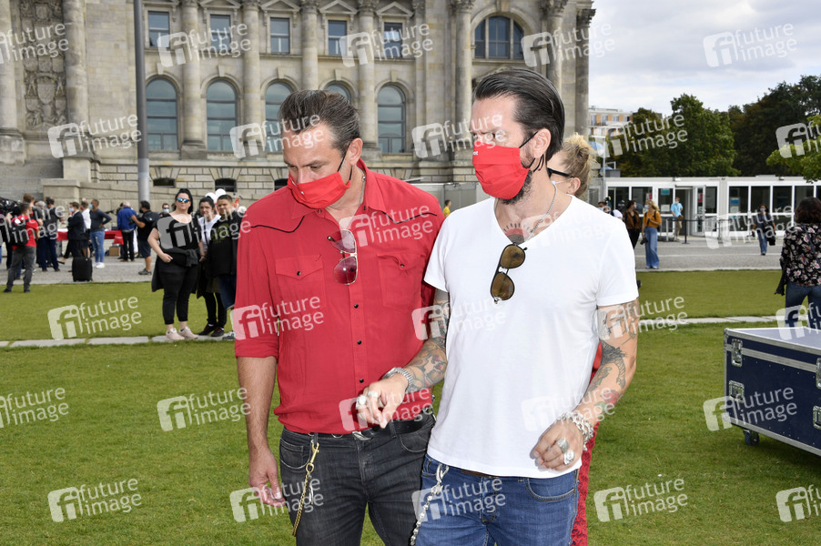 Sascha Vollmer und Alec Völkel von The BossHoss legen ihr letztes Hemd vor dem Reichstagsgebäude ab - Unter dem Motto #AlarmstufeRot protestieren Mitarbeiter der Kultur-und Veranstaltungsbranche in Berlin für Soforthilfen für die Veranstaltungswirtschaft. Durch die Schließungen und Absage von Veranstaltungen während der Corona-Pandemie stehen viele Kulturschaffende, Veranstalter, Messe- oder Bühnenbauer, Techniker und Kunstschaffende vor dem Aus. Berlin, 09.09.2020
