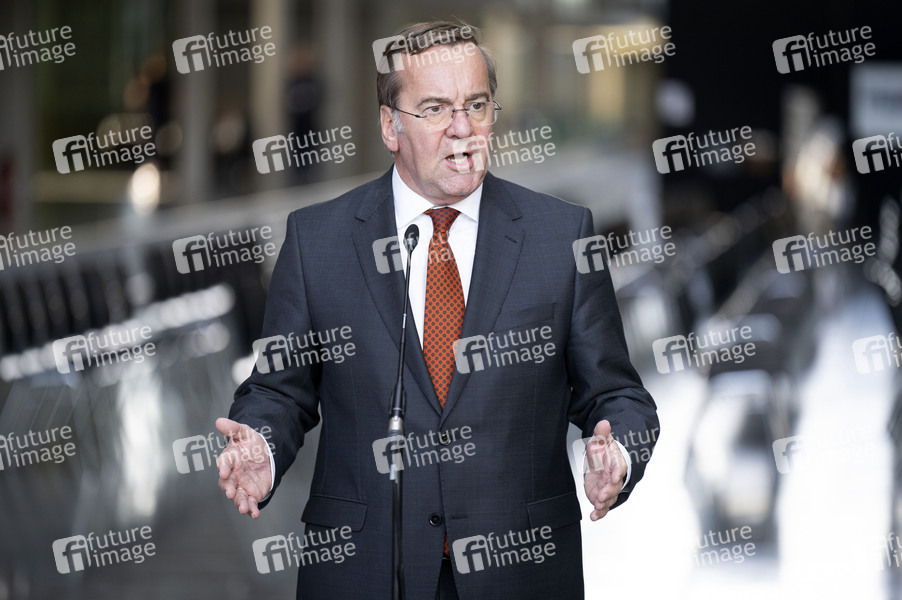 Boris Pistorius bei der Pressekonferenz zur Weltraumsicherheitsstrategie der Bundesregierung im Paul-Löbe-Haus. Berlin, 19.11.2025