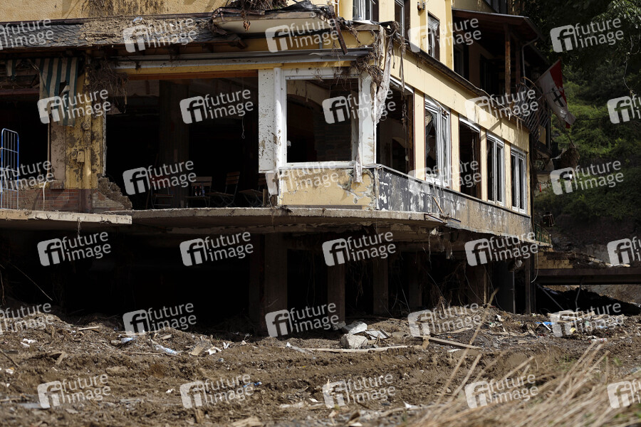Nach dem Jahrhunderthochwasser in der Eifel durch heftige Regenfälle und Dauerregen mit Überschwemmungen und Überflutungen haben die Aufräumarbeiten im Ahrtal große Fortschritte gemacht. Einheiten von Polizei, THW, Bundeswehr und Feuerwehr mitsamt vielen freiwilligen Helfern haben Straßen geräumt, Schutt und Schlamm entfernt und die Menschen versorgt. Der Wiederaufbau wird trotzdem Jahre dauern. Im Bild Flutschäden in der Ortschaft Mayschoß, in der die Flut viele Häuser zerstörte, 08.08.2021
