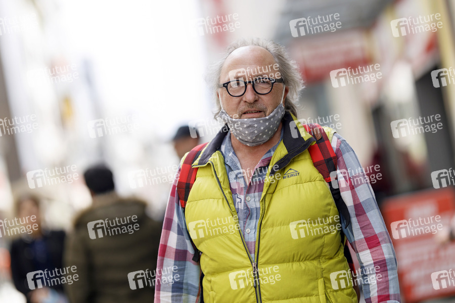 Urban Priol posiert mit Mundschutz im Rahmen eines WDR-Interviews auf der Hohe Straße. Köln, 29.04.2020