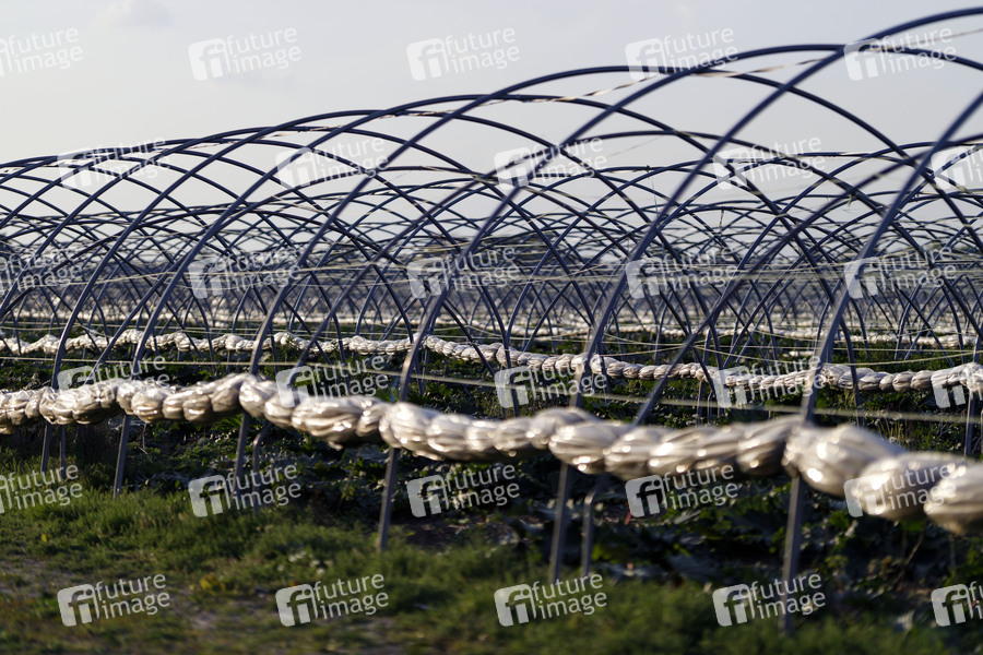 Rhabarber, Rheum rhabarbarum, Plantage, Ackerbau, Landwirtschaft, Gemüse, Folientunnel, Foliendach, Rhabarberplantage, Gewächshaus, Anbau, Acker, Ernte, Rhabarberstangen, Bauernhof, Knöterich, Knöterichgewächse, Bewirtschaftung, Photosynthese, Fotosynthese, Kultivierung, Pflanzung, Pfllanzenaufzucht, Selbstversorger, Standort, Bewässerung, Garten, Nutzgarten, Gartenbau, Symbolbild, Symbolfoto