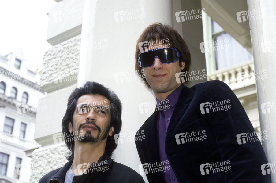 George Alexander und Cyril Jordan von The Flamin’ Groovies bei einem Photocall vor einem Hotel. London, 10.09.1987