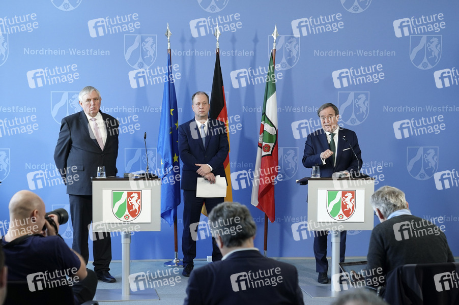 Gesundheitsminister Karl-Josef Laumann, Familienminister Joachim Stamp und Ministerpräsident Armin Laschet bei einem Statement zur aktuellen Lage in Nordrhein-Westfalen in Bezug auf das Corona Virus in der Staatskanzlei. Düsseldorf, 17.03.2020