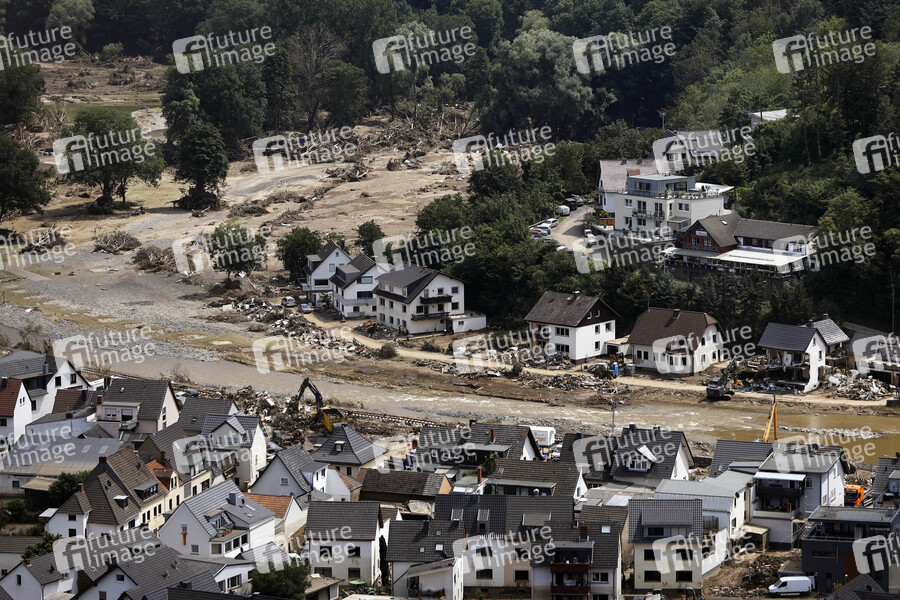 Nach dem Jahrhunderthochwasser in der Eifel durch heftige Regenfälle und Dauerregen mit Überschwemmungen und Überflutungen haben die Aufräumarbeiten im Ahrtal begonnen. Einheiten von Polizei, THW, Bundeswehr und Feuerwehr mitsamt vielen freiwilligen Helfern räumen Straßen, entfernen Schutt und Schlamm und versorgen die Menschen. Im Bild zerstörte Häuser in der Ortschaft Dernau, in der die Flut viele Häuser zerstörte, 22.07.2021