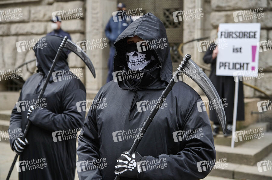 Als Sensenmänner verkleidet und mit Särgen protestieren Berliner Polizisten für eine Entschädigung nach der Schießstand-Affäre. Jahrelang trainierten Polizisten und Personenschützer an einem schadstoffbelasteten Schießstand. Einige verstarben an Krebs, andere sind schwer erkrankt. Berlin, 15.04.2021