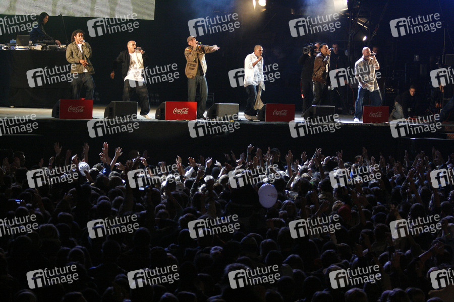 Culcha Candela live beim Coca Cola 'Soundwave 2007' vor dem Brandenburger Tor in Berlin. Die Sänger Jonny Strange (Uganda), Larsito (Kolumbien), Itchyban (Polen), Lafrotino (Kolumbien), Mr. Reedoo (Deutschland), Don Cali (Kolumbien) und DJ Chino con Estilo (Republik Korea)