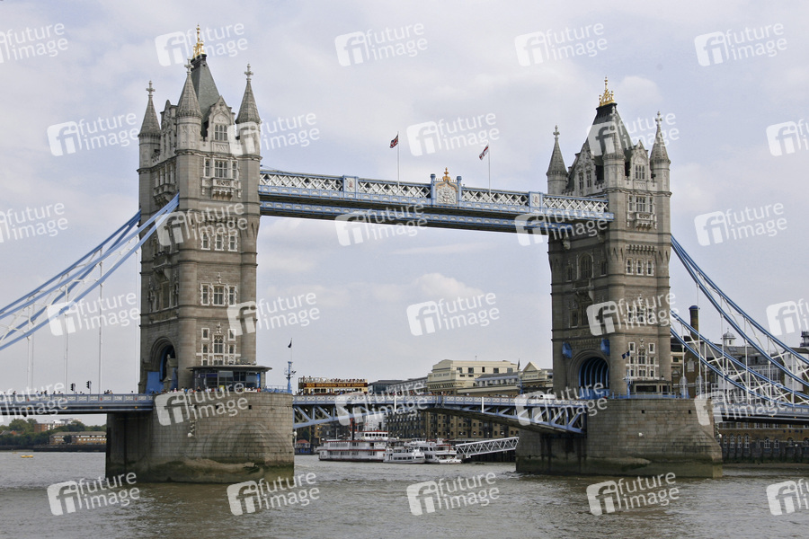 Klappbrücke, Neugotik, 244 Meter lang, Höhe der Brückentürme 65 Meter, die Fahrbahn zwischen den 61 Meter voneinander entfernten Türmen liegt neun Meter über dem Fluss, Fußgängerbrücke in 43 Meter Höhe, die beiden Baskülen können bis zu einem Winkel von 83 Grad hochgeklappt werden, Architekt Horace Jones, erbaut 1886 bis 1894, Themse