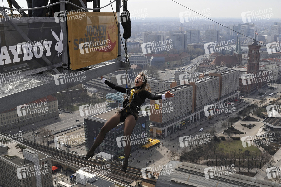 Playboy Playmate Base Flying vom Dach des Park Inn Hotels am Alexanderplatz, Berlin